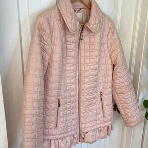 In great condition. Gold zippers and logos. Dainty blush pink colour with a unique dainty ruffled hemline. Perfect for fall or spring or a lighter errand or car coat in the winter. Could be dressed up for work officecore business or even formal events. Would look great as well as a casual piece with jeans.