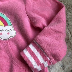 You’ll find fashion gold at the end of this rainbow! This ultra-soft baby pink sweatshirt hoodie from Nannette features a rainbow appliqué with two blushing clouds at either end. Size 12 months.