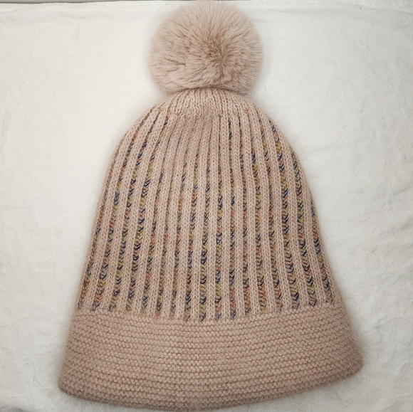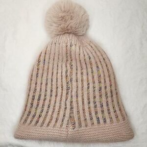 Slouchy Dusty Pink Ribbed Knit Colorful Stripe Toque Beanie Winter Hat with big Pink Pompom.