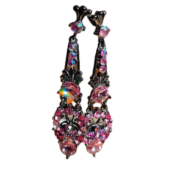 Express Earrings in pink Rhinestone on dark -pewter like metal tone finish chandelier earrings. Like new condition, excellent. Leverback closure. 3 inches or 8.5 cm long.