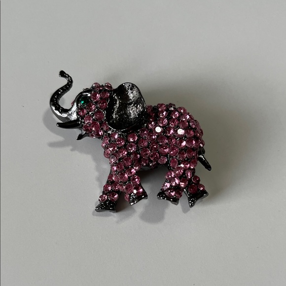 Sparkling pink rhinestone elephant brooch with pewter accents. Perfect for adding a touch of whimsy to any outfit.
