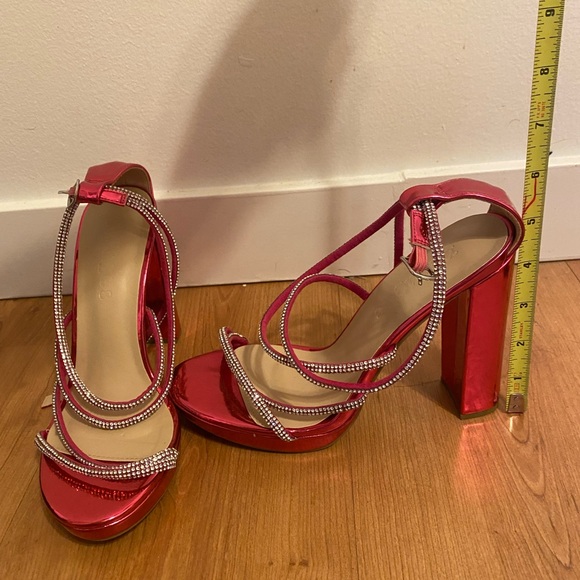 Bold magenta pink 5 inch strappy platform heels with sparkling rhinestone detailing. Secure ankle strap and wide block heel for confident, comfortable wear. Perfect for parties and nights out to elevate any outfit in vibrant pink.