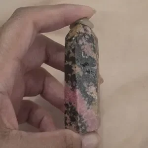 Unique pink and black rhodonite tower. Perfect for decor or collection.
