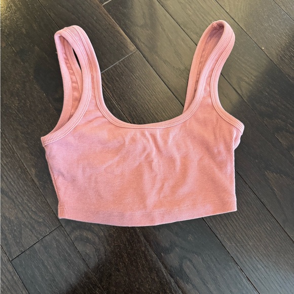 Stylish pink ribbed crop top with wide straps. Perfect for casual wear.