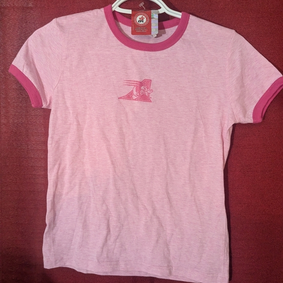 Stylish Montreal Alouettes pink ringer t-shirt featuring a unique logo on the front. Perfect for casual wear. NWT size medium