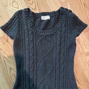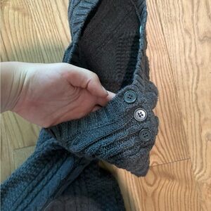 Elegant cable knit dress in charcoal. Ideal for cozy wear. Cute button details on the sleeve. Size small, mini dress.