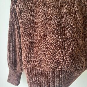 Pink Rose sweater, chenille sweater, brown pullover, soft knit, textured knit, cable knit, cozy sweater, size XS, comfy loungewear, fall outfit, winter style, plush knit, rich brown, chocolate sweater, snuggly knit, warm top, ribbed hem, casual pullover, cottagecore, soft girl style, hygge, layered look, relaxed fit, knitwear, knit texture