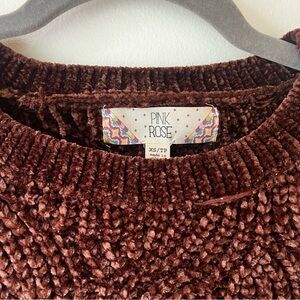 Pink Rose sweater, chenille sweater, brown pullover, soft knit, textured knit, cable knit, cozy sweater, size XS, comfy loungewear, fall outfit, winter style, plush knit, rich brown, chocolate sweater, snuggly knit, warm top, ribbed hem, casual pullover, cottagecore, soft girl style, hygge, layered look, relaxed fit, knitwear, knit texture