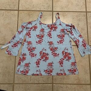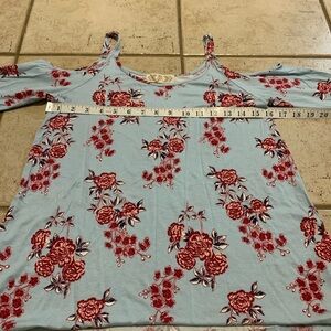 Pink Rose Cold Shoulder Floral Top - Light Blue & Burgundy - Size S
