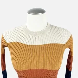 Vibrant, fitted, and full of fall charm 🍁 This Pink Rose ribbed knit sweater features bold colorblock stripes in cream, mustard, rust, and navy — a classic palette that transitions effortlessly from autumn to winter. Crafted from a soft rayon-polyester blend, it has a stretchy, body-hugging fit and a crew neckline for a flattering, modern silhouette.