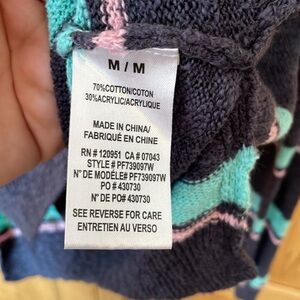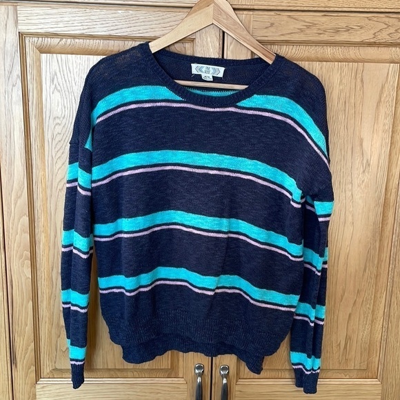 EUC blue, pink, turquoise striped lightweight knit sweater from Pink Rose in a size medium. Cotton/acrylic blend.