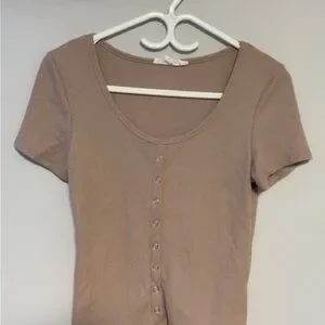 Chic taupe ribbed tee with button-up front. Perfect for casual outings.
