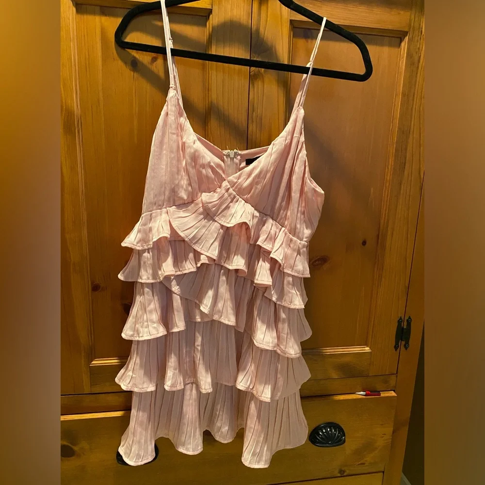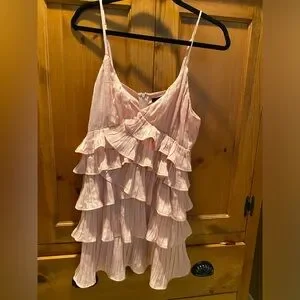 Super cute pink mini dress with ruffles! This dress is NWT since it’s a little too small for me. I’d say it fits a medium better than a large as there is no stretch with a back zip. Would be super cute to wear to the Eras tour if you wanted to dress for the Lover era 🩷 please note there is a small defect where near one front strap - the strap is still attached fully to the dress but the front has separated for the lining. This should be an easy fix! Price reflects this flaw :)