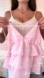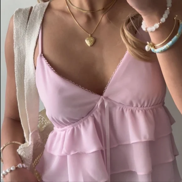 Soft light pink camisole with delicate lace trim. Layered ruffle tiers for a feminine look. Thin adjustable straps and a center tie detail. Lightweight and flowy fabric.
