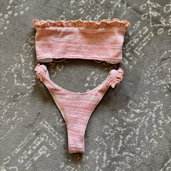 Excellent condition, worn maybe twice bandeau bikini with ultra cheeky bottoms. Feminine rubble detail on bandeau and sides of bottoms. Knit material, fully lined. Purchased from REVOLVE. SIZE 2. I’m a 32D, and wear a 26 jeans for reference.