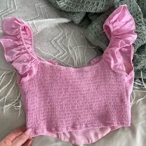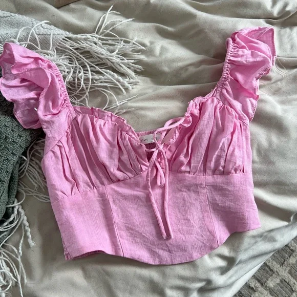 Soft pink cropped top with ruffled shoulder straps. Sweetheart-style neckline with a front tie. Lightweight, gathered bodice for a feminine fit. Easy to pair for warm-weather looks.