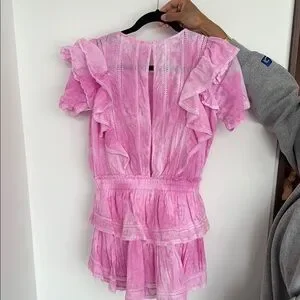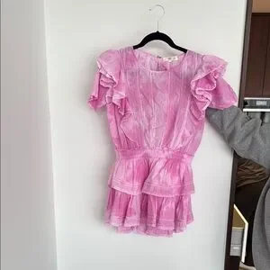 Natasha Heritage Mini Dress. Charming pink dress with ruffled sleeves and layered skirt. Perfect for a stylish look. Super nice for a summer evening going out to dinner indoors and outdoors.