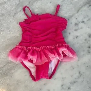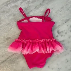 Adorable pink swimsuit with ruffled tutu design. Perfect for a fun day at the pool.