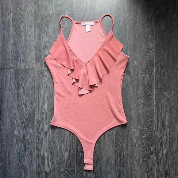 This pink bodysuit features a charming ruffled V-neckline that adds a romantic touch to its sleek design. Made from a soft, stretchy material, it offers comfort and style, making it perfect for both casual and dressy occasions.
