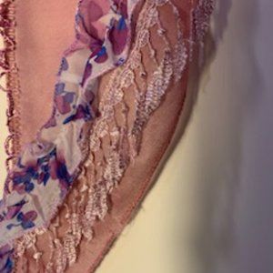 Triangle scarf can add feminine elegance to your outfit ! Pink with purple flare ! There are pink dangling leaves along the entire edge.