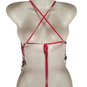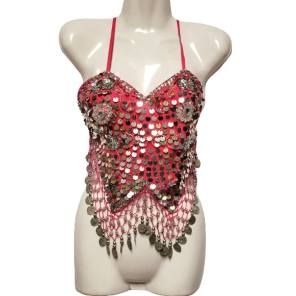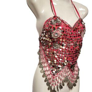 Pink Sequin Halter Crop Top Silver Sequin Backless Belly Dancing Tops NEW