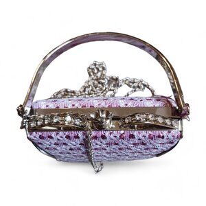 Ideal for prom, formal events, weddings, cocktail parties, special occasions, New Year's celebrations, and those embracing Princess, Vegan or Barbiecore aesthetics. Dimensions: approximately 5.5" x 4. Fold away crossbody chain. This is a new, never-used display piece from a formal wear/bridal salon. May have slight scratches on the silver hardware.