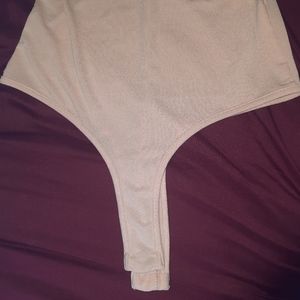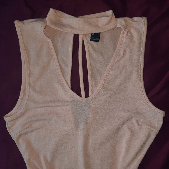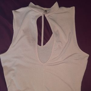 Size small women's pink bodysuit. Has a choker strap around the neck with attaching strap that goes down the chest in the front. The back has a cute little slit that goes down to mid back. Missing one button insert, easy fix if you know how to sew!