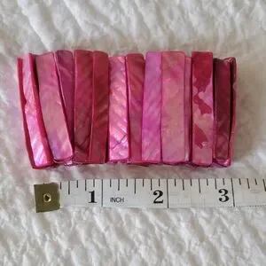Pink shell stretch bracelet made of rectangular pieces of pink-hued shells connected by an internal elastic band.