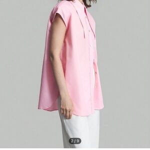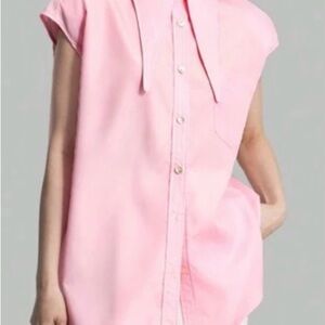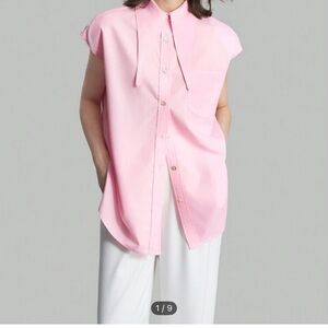 Stylish pink sleeveless button-up shirt. Features a classic collar and button details.