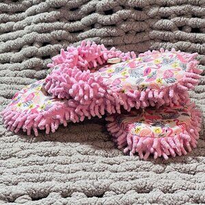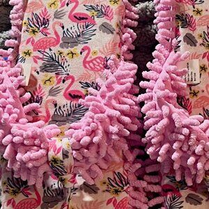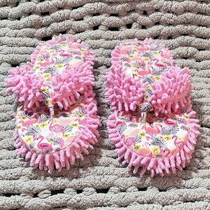 Pink Flamingo Print with Pink super soft fringe Designed for easy on-and-off wear Cushioned support Ideal for indoor use and quick trips outside. Non-slip sole for safety on wood or tile floors Size - Large (9-10)