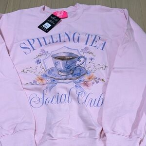 Cozy pink sweatshirt with 'Spilling Tea Social Club' design. Features a teacup graphic.