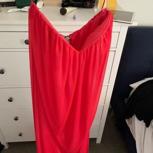 purchased for a wedding (worn once). Overlay is sheer pink and under is a short pink dress (so you can see your legs which is very pretty). Strapless with a sweetheart neck.