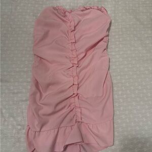 Chic pink strapless dress with ruched detailing. Perfect for any occasion.