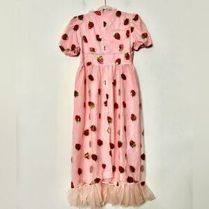 Charming pink dress with strawberry embroidery. Features a tie-front detail and puff sleeves. Perfect condition.