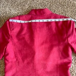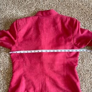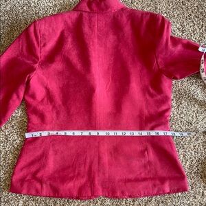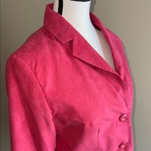 This vibrant pink blazer features a tailored fit and classic notched lapels, making it a standout piece in any wardrobe. The textured fabric adds a touch of casual elegance to its structured design. Although polyester, looks like suede. No stretch.
