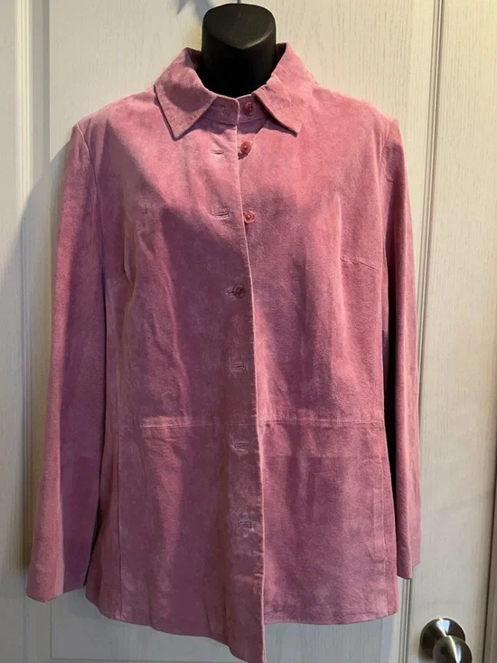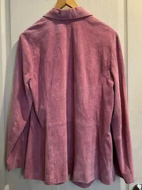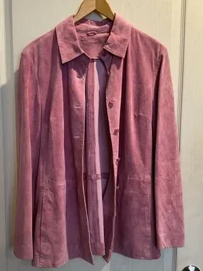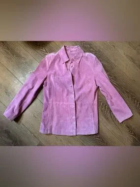 Soft pink suede jacket with full button front. Classic collar and long sleeves. Smooth, simple silhouette. Versatile layering piece.