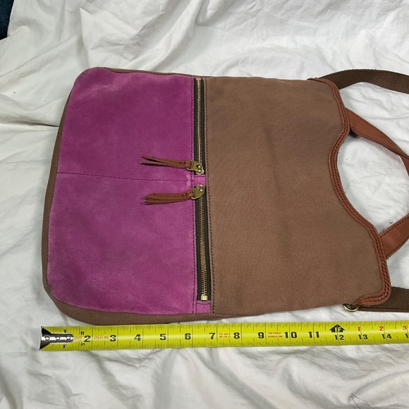 Pink Suede and Tan Canvas Fossil Tote Crossbody Bag