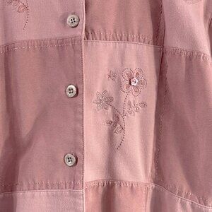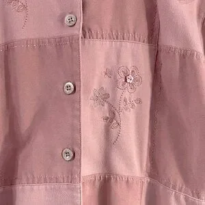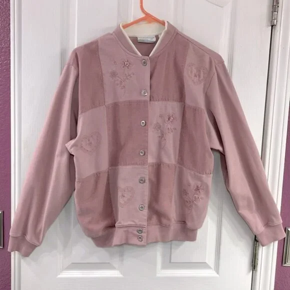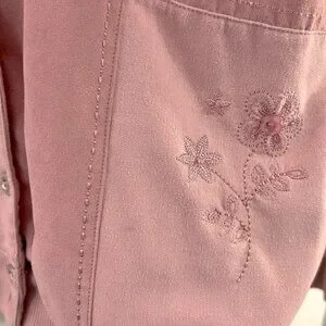 Vintage, Soft pink, button up sweater with hand stitched design. Has pockets for hands. Discounted for tiny stain on front side which is hard to see unless looking up close; see last photo.