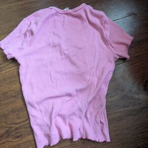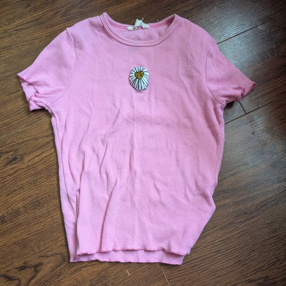 Charming pink t-shirt featuring a daisy embroidery on the front. Perfect for casual wear.