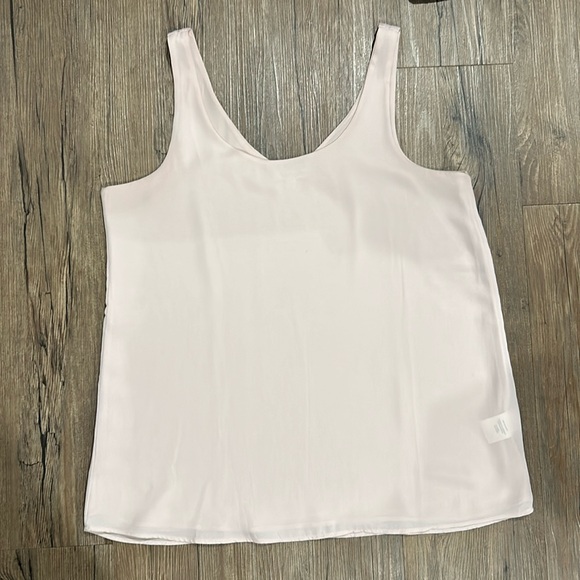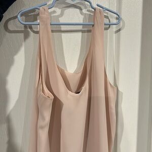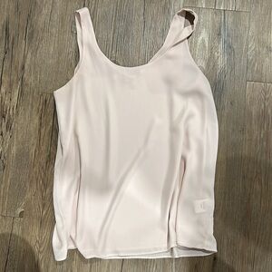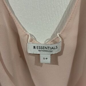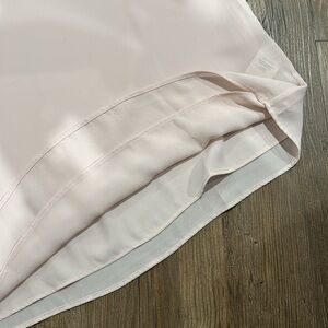 Purchased from Reitmans and wore once. Didn’t realize I purchased a small and not a medium! I’m great condition. It’s a soft, flow-y material. Pictures are in 2 different areas with different lighting. It is a soft pale pink colour and has double layers of fabric (see photo for reference) so that it is not see-through.