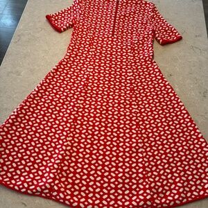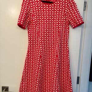 Size medium. The material is very thick and stretchy. Bold colour. This is a power dress yet feminine.