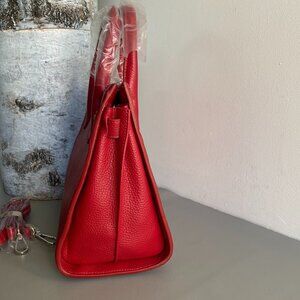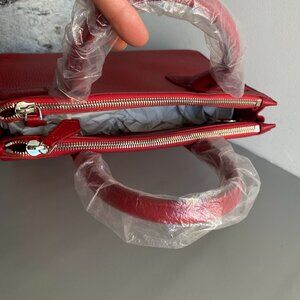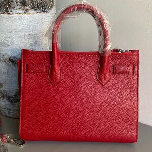 New Without Tag Pink Tartan Toronto Red Pebble Leather Chase Satchel Crossbody Bag . Features: Structured Bag. adjustable, detachable crossbody strap, pockets: inner zip pocket, 2 inner cell ph pockets & 2 zipper compartments at top of bag, dual rolled handles, silver tone hardware. Full description in photos. From a smoke free/pet free home.