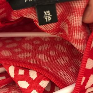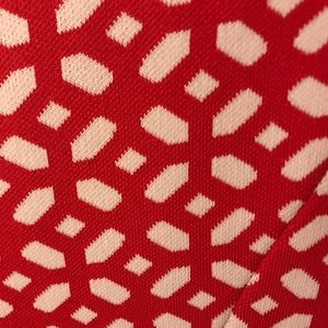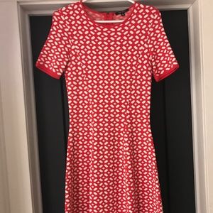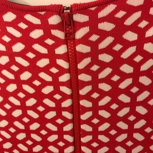 This is a hardly worn dress with no damage. The dress is red and white patterned, with a visible red zipper at the back, with short sleeves and flares slightly through the hip. It is in Pink Tartan's signature thick fabric that falls nicely. Very flattering, Canadian designed, and great as a professional piece.