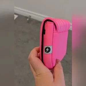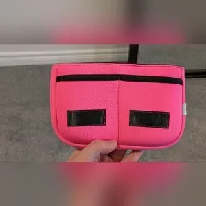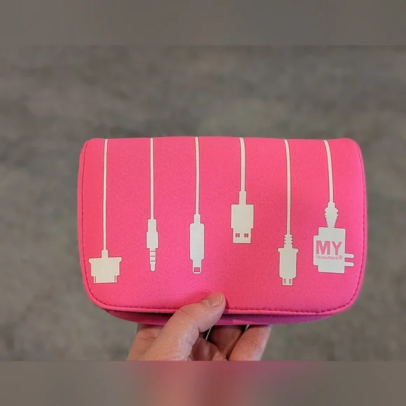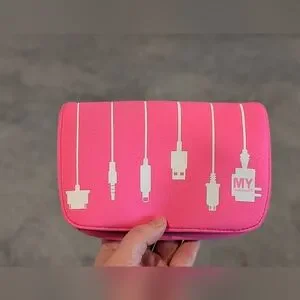 Stylish pink pouch with tech-themed design. Perfect for organizing cables and gadgets.