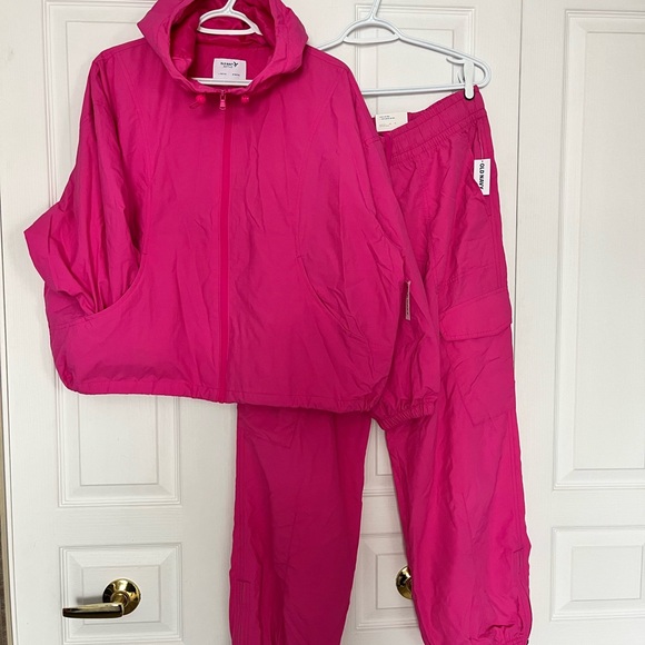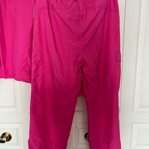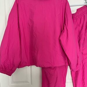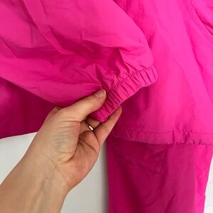 Vibrant hot pink jacket with matching pants. Quick dry fabric for comfort and style.