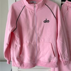 Stylish pink tracksuit set. Includes a zip-up jacket and matching pants. Perfect for casual wear.