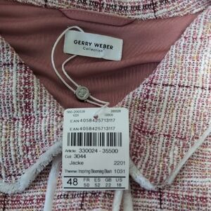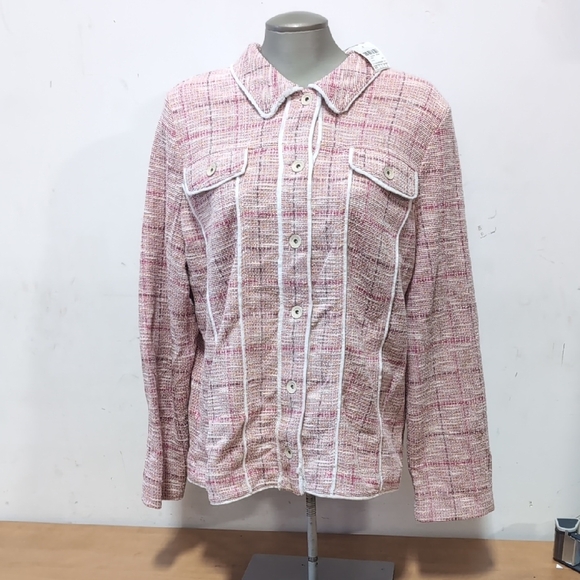 Stylish pink tweed button-up jacket with white accents. Perfect for a chic look.