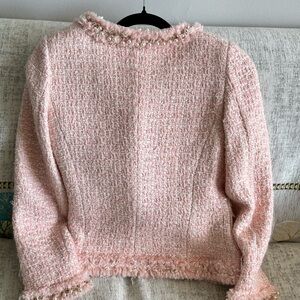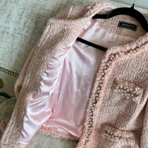 Elevate your style with the Pink Tweed Jacket. This elegant piece features a classic design with pearl embellishments, perfect for any occasion.