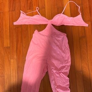 Stylish pink two-piece lounge set. Includes a twisted crop top and matching pants. Perfect for casual wear.