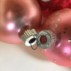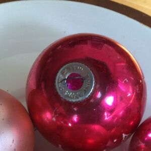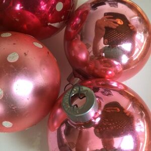 The larger fuchsia ornament has a church and tree scene stencilled on it. The sold pink and polka dotted ornament was made by shiny brite while the shiny pink ornament were made in the U.S.A. All are in fair vintage condition.